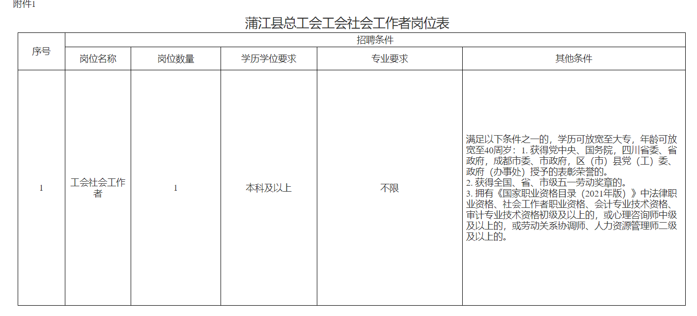 基层工会社会工作者1名,工作岗位由蒲江县总工会根据工作需要统一分配。