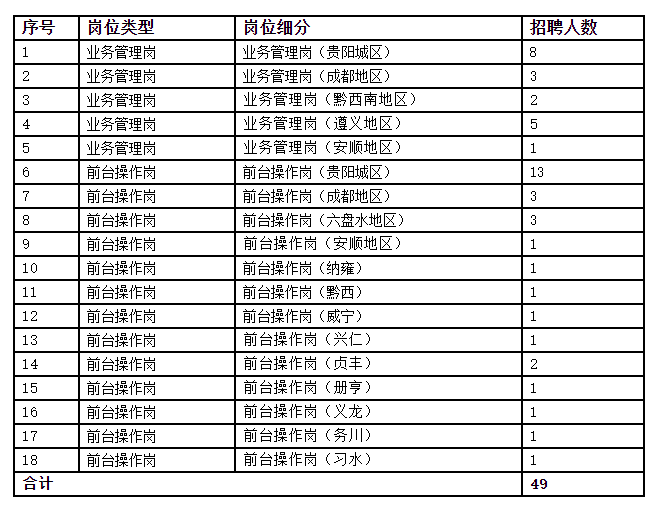 分支行业务管理岗19人、分支行前台操作岗30人。