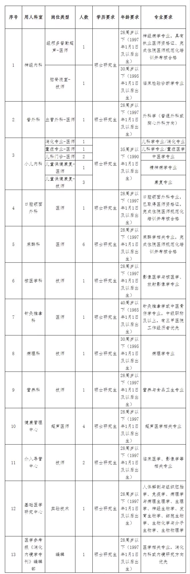 备注:应聘临床岗位者执业医师证注册专业应与报考岗位相符,或者能够注册到报考岗位专业。