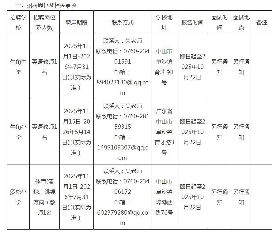 阜沙镇位于中山市北部,水陆交通便利,是广东省教育强镇。辖区内有公办中小学6所,因工作需要,镇属牛角中学、牛角小学、罗松小学等三所公办学校现面向社会招聘非编教师3名。具体情况如下: