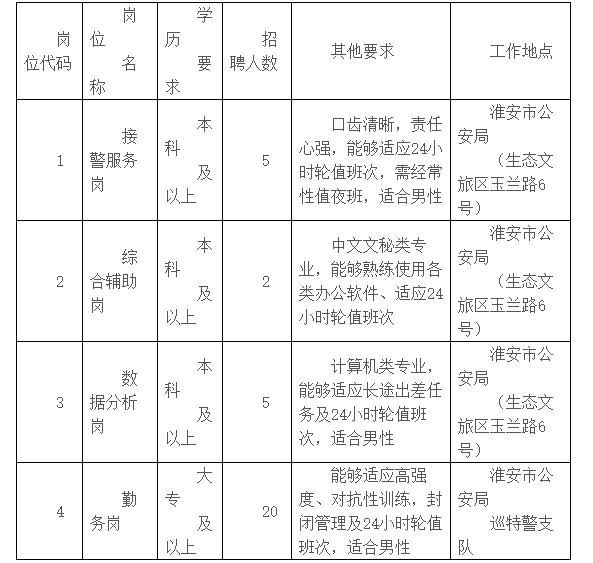 因工作需要,淮安市公安局计划面向社会公开招聘32名警务辅助人员。根据《江苏省公安机关警务辅助人员管理条例》及有关规定,现将有关事项公告如下。