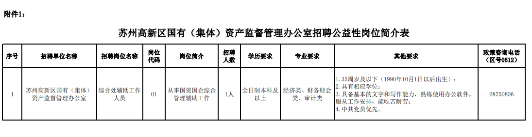附件1:《苏州高新区国有(集体)资产监督管理办公室招聘公益性岗位简介表》