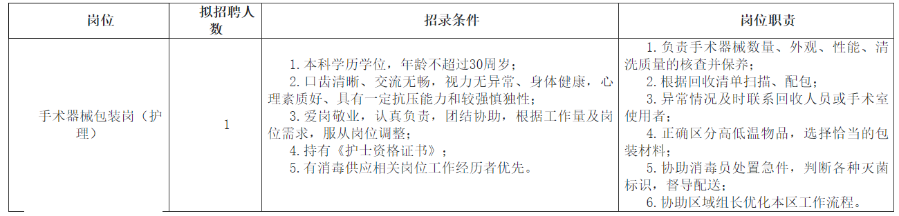 现因工作需要,四川大学华西厦门医院面向社会公开招聘1名消毒供应中心工作人员。详情如下: