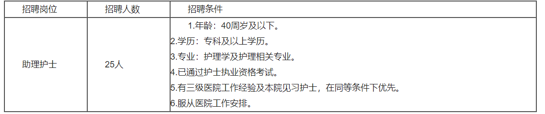 根据医院业务发展需求,现需招聘助理护士25名,具体招聘条件如下: