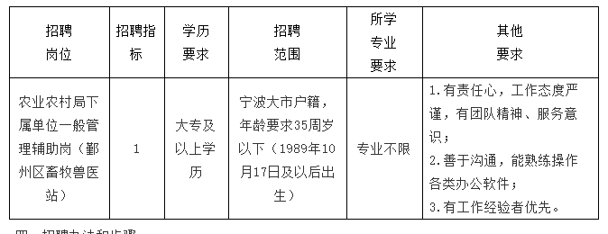 因工作需要,宁波市鄞州区农业农村局下属事业单位拟面向社会招聘编外工作人员1名。具体要求如下: