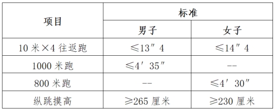 (1)体能测评项目及标准:纵跳摸高、10米×4往返跑、男子组1000米跑、女子组800米跑。