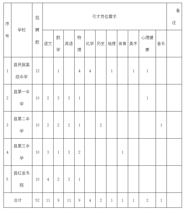 根据县民族高级中学、县第一中学、县第二中学、县第三中学、县红岩书院实际需求,原则上引进教育部直属师范大学(北京师范大学、华东师范大学、华中师范大学、西南大学、东北师范大学、陕西师范大学)全日制毕业生和“优师计划”毕业生(个别紧缺学科,符合第7条要求的,可放宽到省内外其他大学全日制本科及以上毕业生)。
