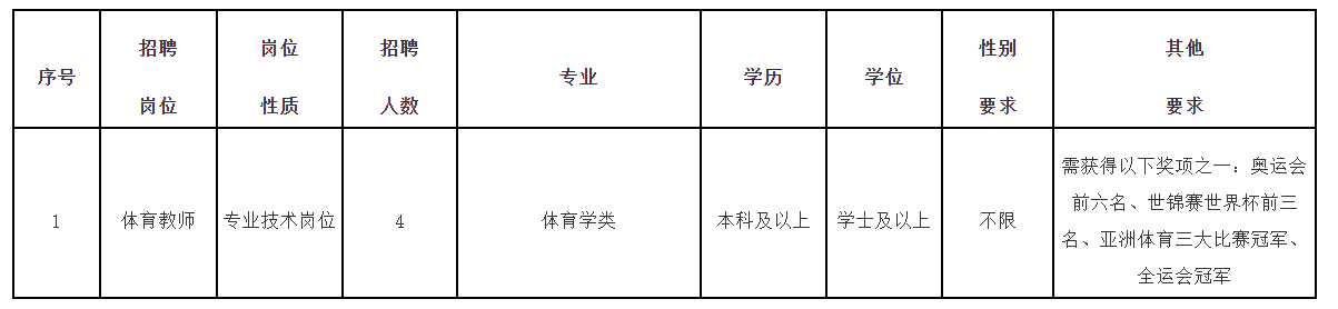 4.应聘资格要求,报考者需获得以下奖项之一:奥运会前六名、世锦赛世界杯前三名、亚洲体育三大比赛冠军、全运会冠军。