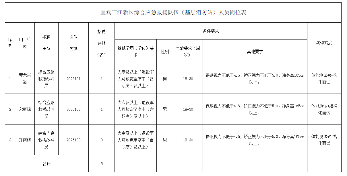 本次招聘街镇综合应急救援队人员共计5名,具体招聘岗位及名额详见《宜宾三江新区综合应急救援队伍(基层消防站)人员岗位表》(附件1)。