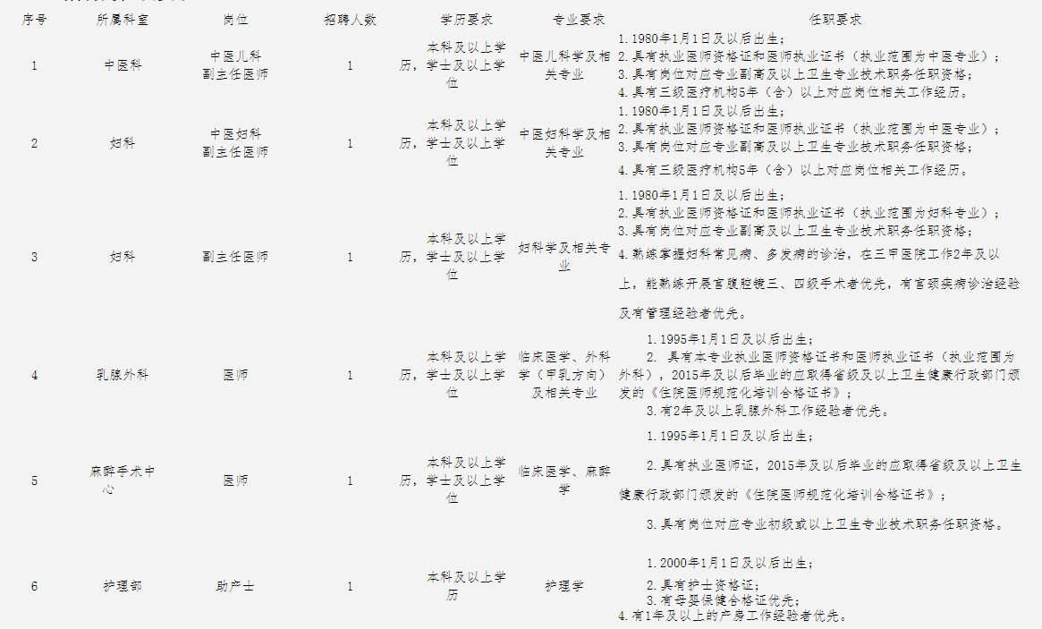因业务发展需要,我院现面向社会招聘中医儿科副主任医师、中医妇科副主任医师、妇科副主任医师、乳腺外科医师、麻醉手术中心医师、助产士,具体信息如下。