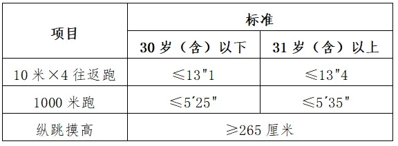 全部考生均需参加体能测评。体能测评项目包括:1000米(800米)跑、4×10米往返跑、纵跳摸高,两项以上测评达标视为体能合格。具体评分标准如下: