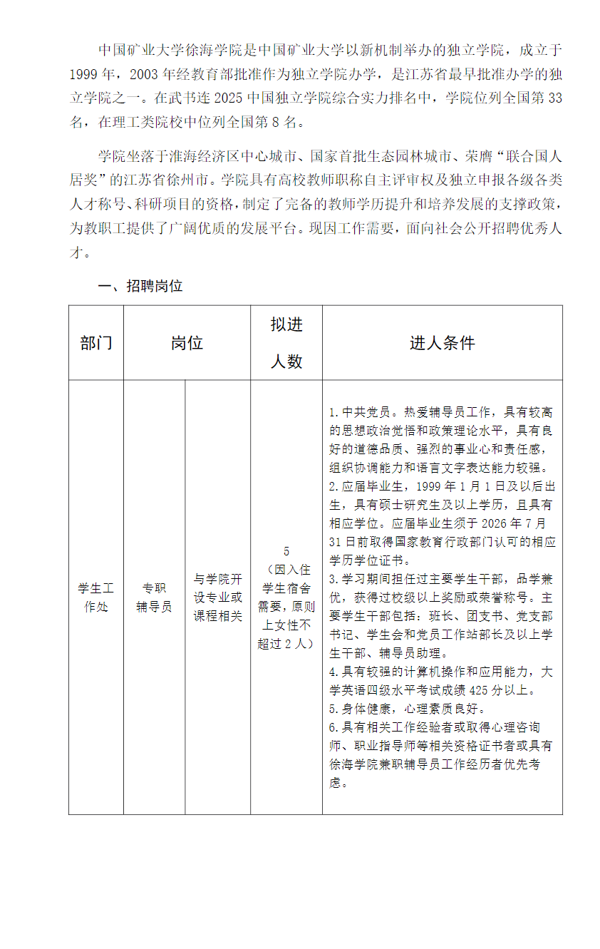 原始标题:中国矿业大学徐海学院2026年公开招聘专职辅导员公告