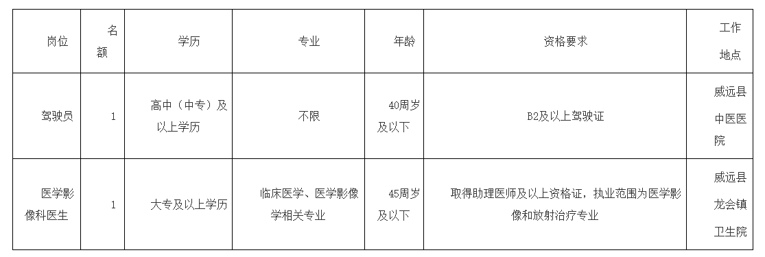 详见《威远县紧密型县域医共体管理委员会公开招聘编外人员岗位及条件要求一览表》。