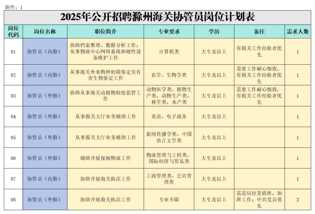 具体岗位及要求见附件《2025年公开招聘滁州海关协管员岗位计划表(附件1)。