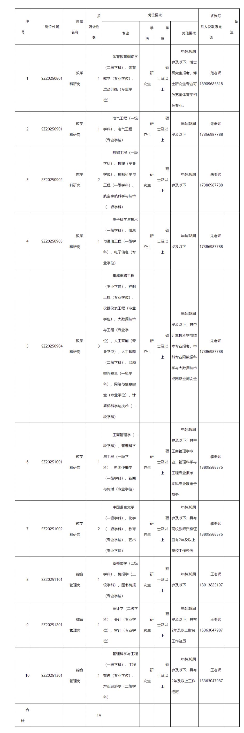 教学科研岗位主要考查:综合素质、学术水平、教学水平、科研能力等。岗位代码SZ20251002测试形式为结构化面试,其他教学科研岗位测试形式为说课和答辩。