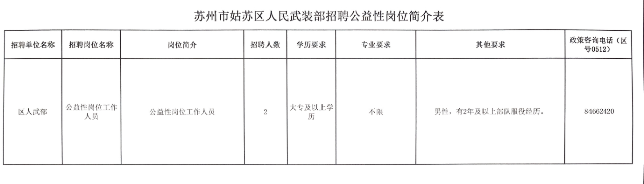 招聘岗位、人数及相关条件详见《苏州市姑苏区人民武装部招聘公益性岗位简介表》(附件)。