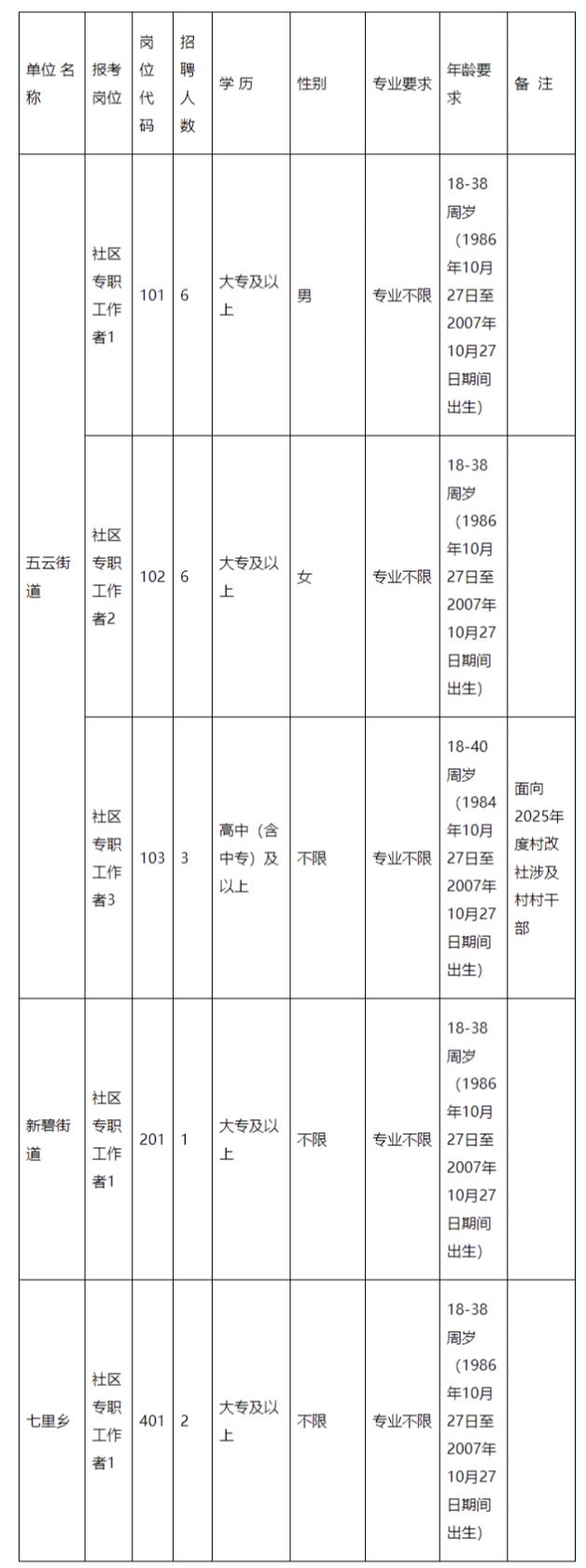 4.年龄要求:18至38周岁(1986年10月27日至2007年10月27日期间出生),其中五云街道社区专职工作者3(代码103)年龄为18至40周岁(1984年10月27日至2007年10月27日期间出生)、村改社涉及村担任村委主职干部(包括村书记、副书记、村主任)的年龄放宽至45周岁(1979年10月27日以后出生);