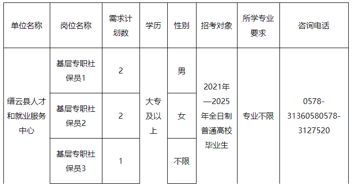 2025年全县共招聘基层专职从事就业和社会保障工作人员5名,具体计划如下: