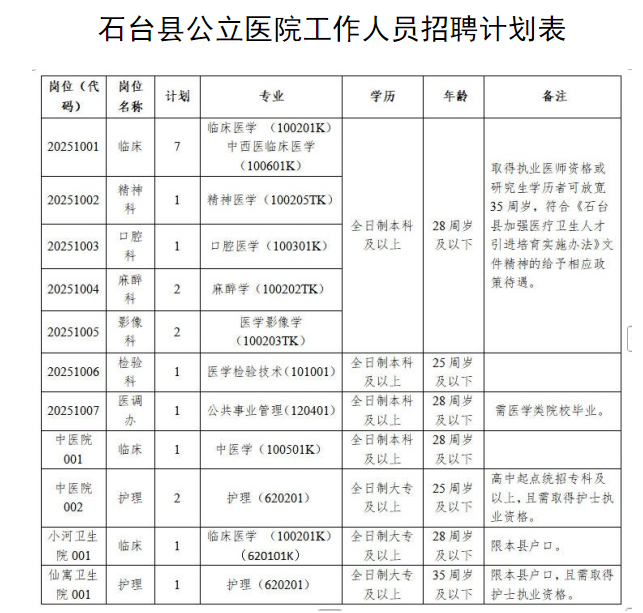 2025年石台县公立医院公开招聘工作人员20名。具体招聘专业详见石台县公立医院工作人员招聘计划表(附件1)。