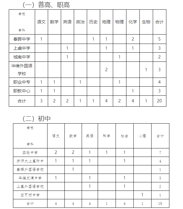 注:实验中学1个语文岗位、1个数学岗位、英语岗位,浙师大上虞附中语文岗位,春晖外国语学校数学岗位,华维文澜中学语文岗位,上虞外国语学校社会岗位,为杭州湾学校南区-竺可桢未来学校(暂定名)储备教师岗位(待该校正式投用后,转任到杭州湾学校南区-竺可桢未来学校(暂定名))。