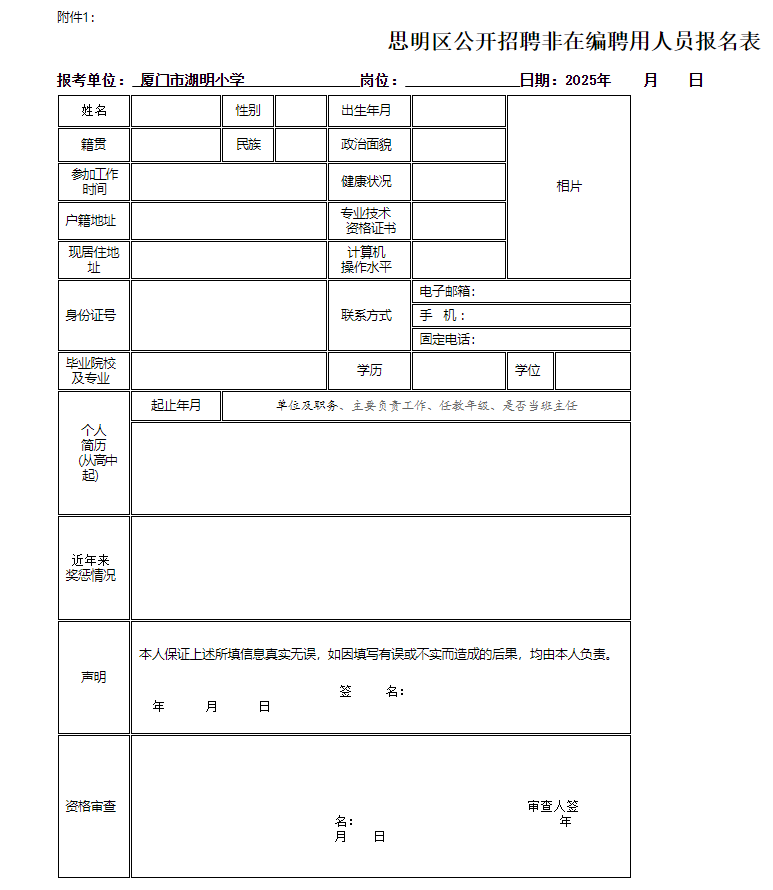 (1)请将如下材料发送至邮箱29816601@qq.com,填写完整的《思明区公开招聘非在编聘用人员报名表》一份(详见附件1)。