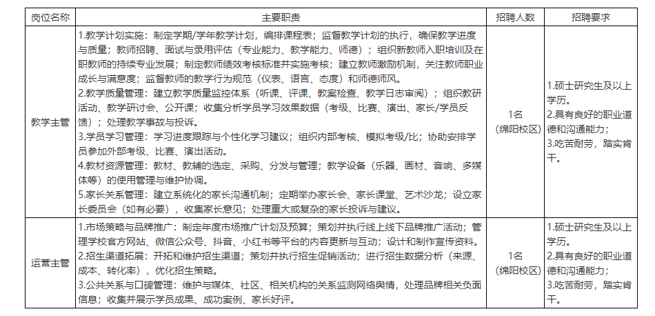 1、报名:凡符合条件且愿意应聘者,填写附件中的简历表。在邮件主题中注明:“姓名+应聘艺术培训中心教学主管/运营主管+绵阳校区”
