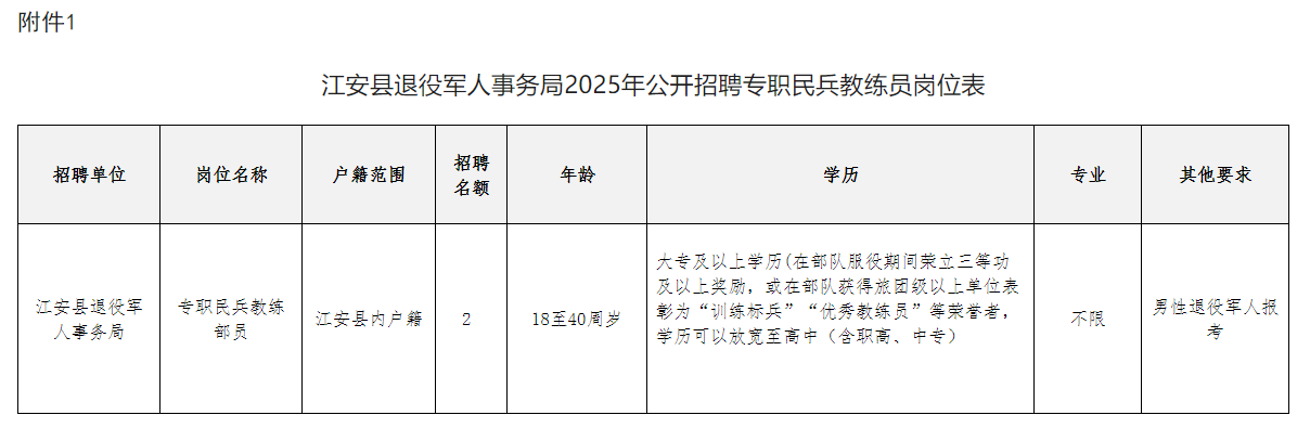 附件:1.江安县退役军人事务局2025年公开招聘专职民兵教练员岗位表