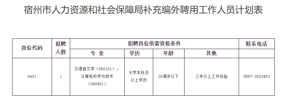 根据工作需要,宿州市人力资源和社会保障局面向社会补充招聘编外聘用工作人员,现就有关事项公告如下:
