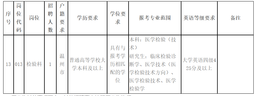 “检验科”岗位(岗位代码为“013”),研究生报考专业增设“医学技术(医学检验技术方向)”、“医学检验技术”、“医学检验学”专业。