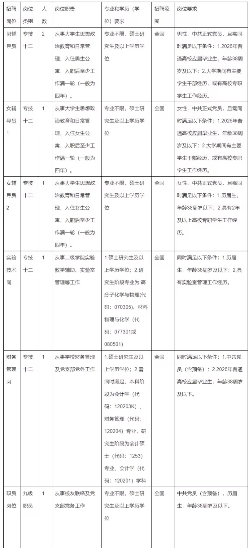 辅导员岗位笔试内容为高等教育学、大学心理学、高校教师伦理学、高等教育法规等相关知识;财务管理岗、实验技术岗笔试内容为综合基础知识及相关专业知识运用能力;职员岗位笔试内容为综合基础知识。