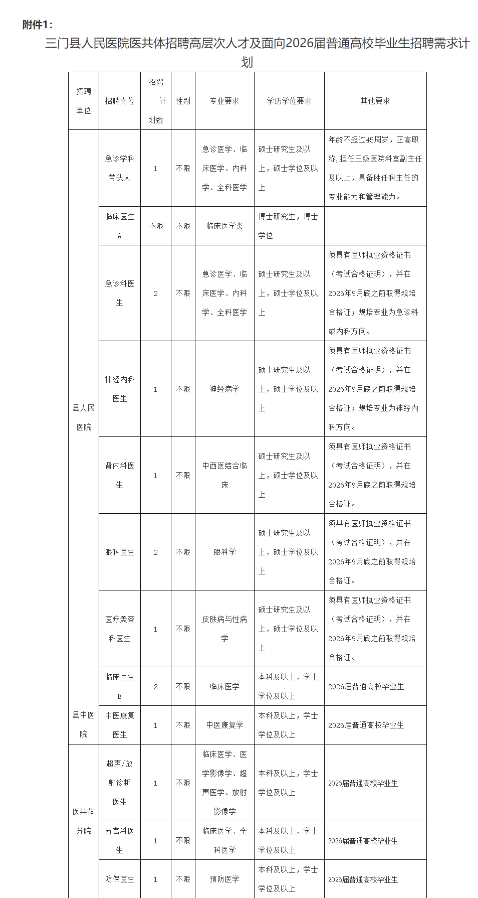 附件:1.三门县人民医院医共体招聘高层次人才及面向2026届普通高校毕业生招聘需求计划