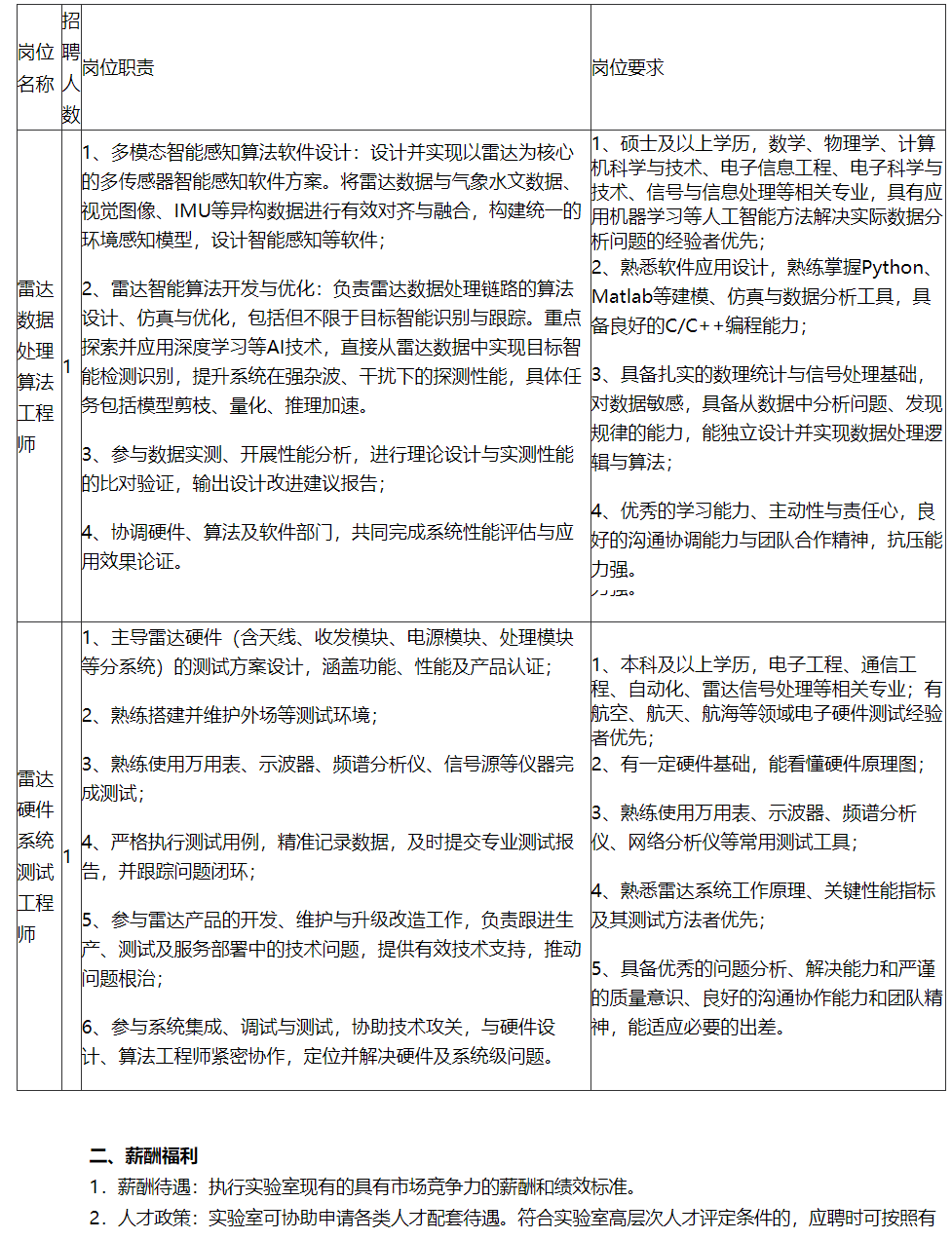 全固态航海雷达研发与产业化项目主要研制兼容现有磁控管雷达和新体制固态雷达信号的新型一体化雷康,解决现有航海磁控管雷达耗电大、辐射强、分辨率低、抗干扰弱、磁控管寿命短、依赖进口以及现有雷康无法应答固态雷达信号限制了固态雷达在航海领域的推广和使用等问题,实现对现有雷康的升级换代,打开了航海雷达固态化的大门,并进一步研制国产化固态航海雷达,打破国外企业对航海雷达产品的垄断地位,实现国产固态航海雷达产业化,开拓全球大市场。根据工作需要,项目组拟招聘以下岗位: