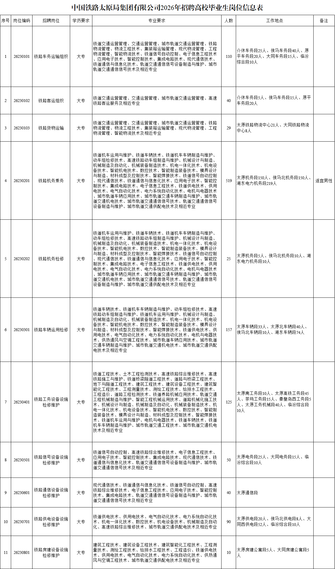 中国铁路太原局集团有限公司根据企业发展需要,现将2026年全日制普通高等职业院校高职(大专)毕业生招聘有关事项公告如下: