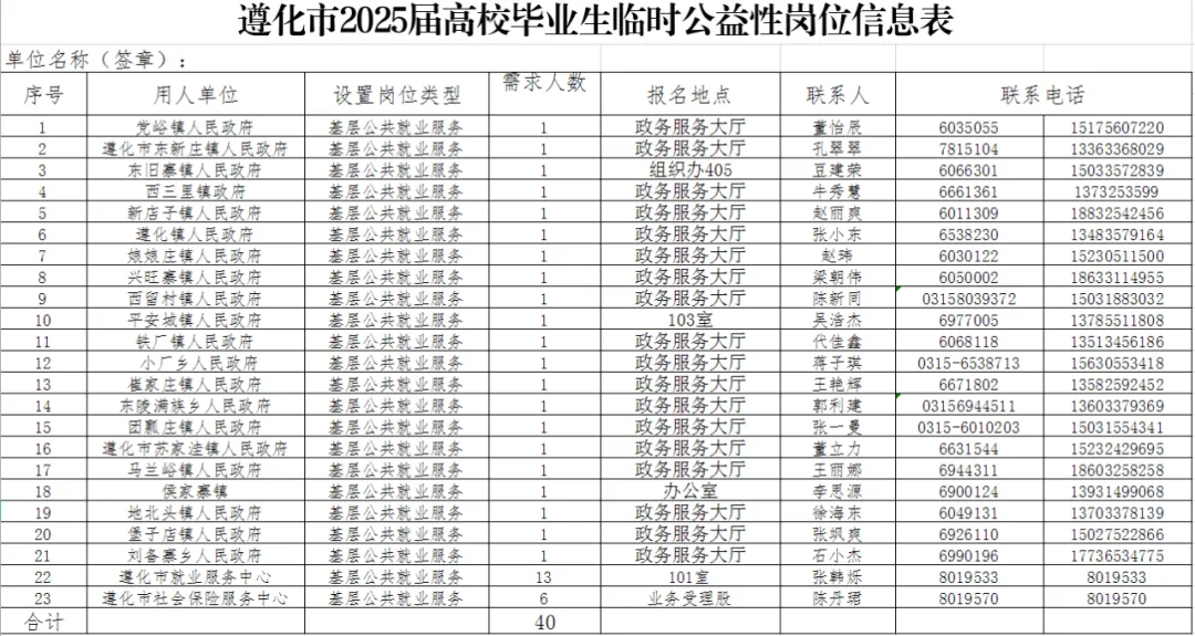 附件:遵化市2025届高校毕业生临时公益性岗位信息表