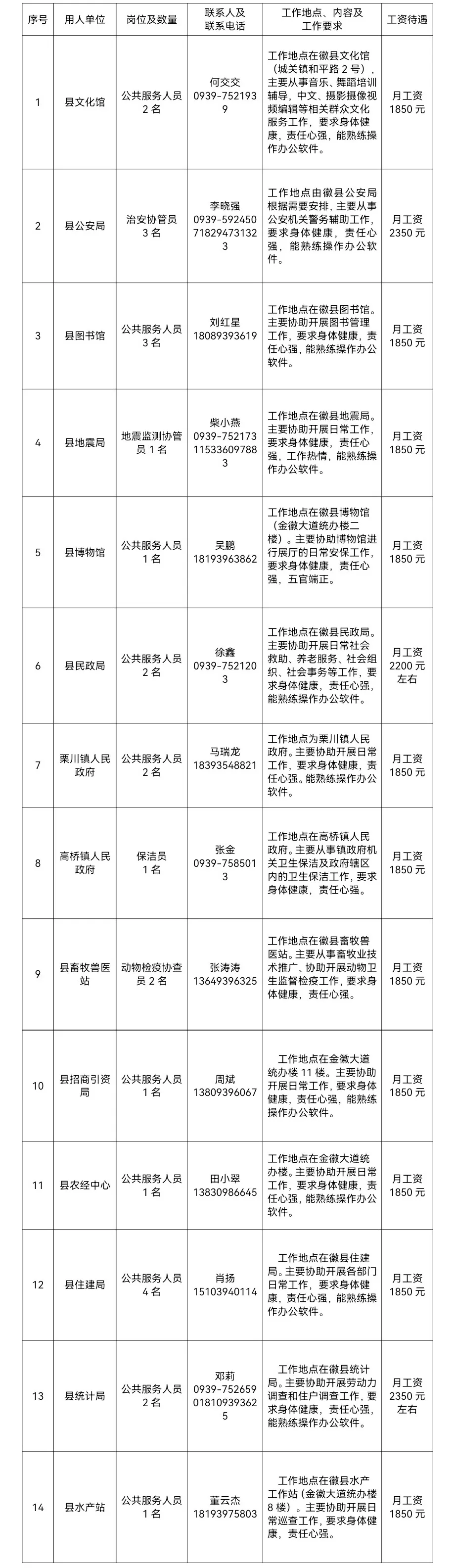 为促进就业困难人员就业,充分发挥公益性岗位托底安置作用,根据徽县人民政府办公室《关于印发<徽县城镇公益性岗位管理办法>的通知》(徽政办发〔2022〕106号)有关规定,现面向社会公开招聘城镇公益性岗位人员。