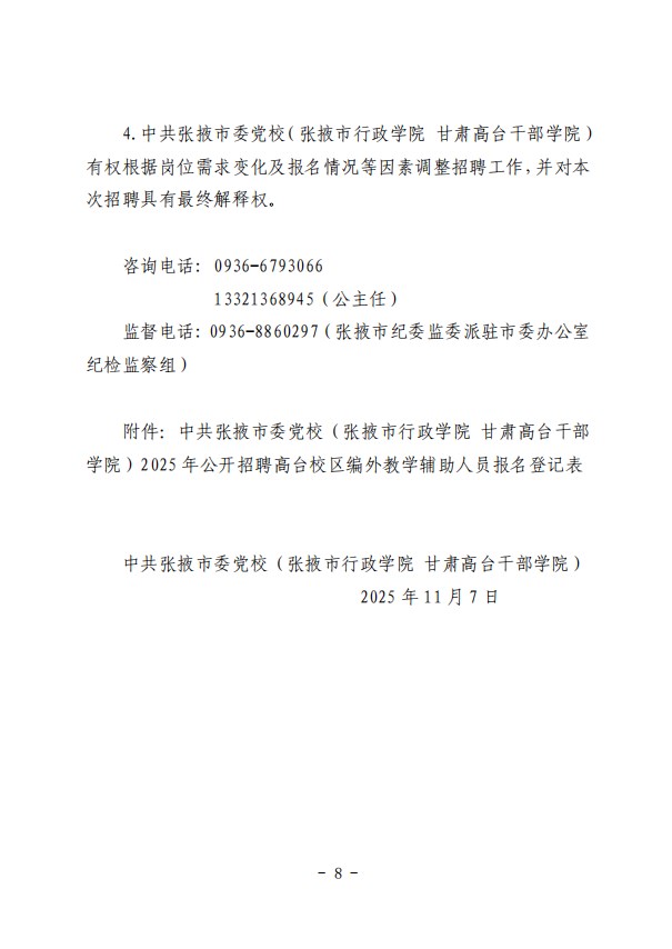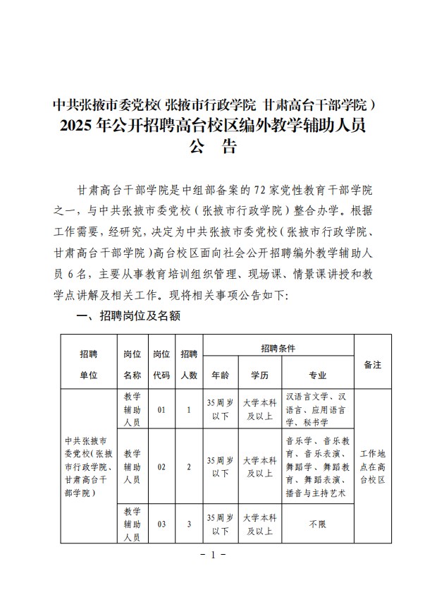 原始标题:中共张掖市委党校(张掖市行政学院甘肃高台干部学院)2025年公开招聘高台校区编外教学辅助人员公告