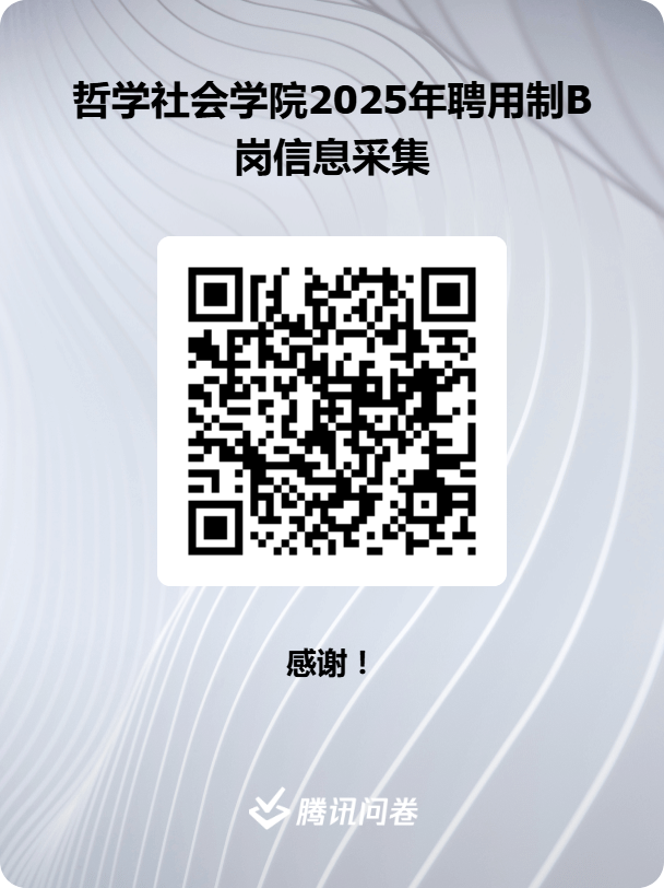 1.应聘者在线填写《兰州大学哲学社会学院聘用制B岗信息采集表》(附件2,扫描二维码填写提交),并将《兰州大学哲学社会学院聘用制B岗应聘报名表》(附件1)、个人简历、学历学位证书扫描件及其他佐证材料电子版合并成一个PDF文件,于2025年11月14日18:00前发送至邮箱:zhexx@lzu.edu.cn。注意文件命名及邮件主题均为“姓名+B岗报名表”。填写不符合要求者不予查收。