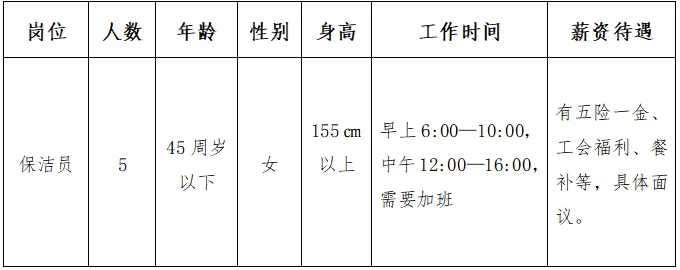 本次计划招聘保洁员5人,具体岗位要求详见附件。