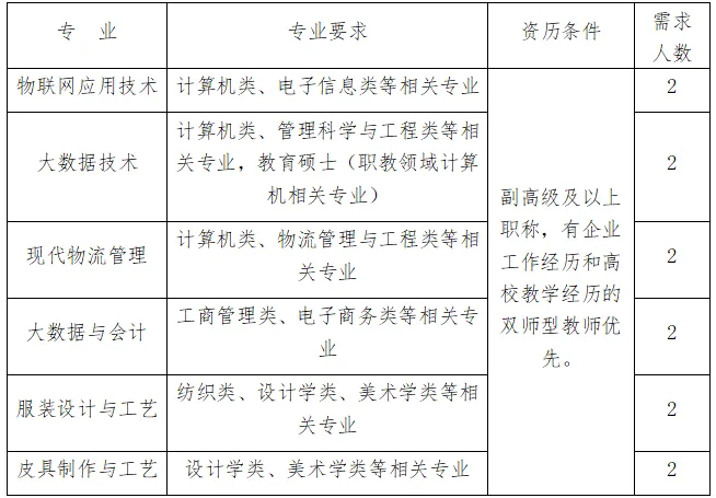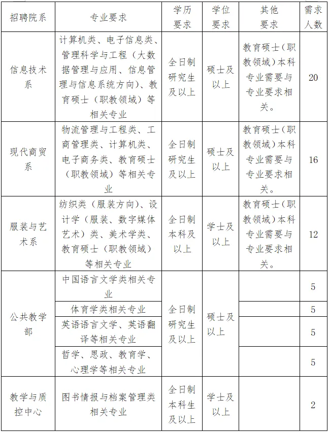 学校初设服装与艺术学院、大数据学院、现代财经商贸学院及公共教学部等教学部门,计划于明年7月开始招生。现面向社会公开招聘专业带头人12人,专任教师及教辅人员80人。