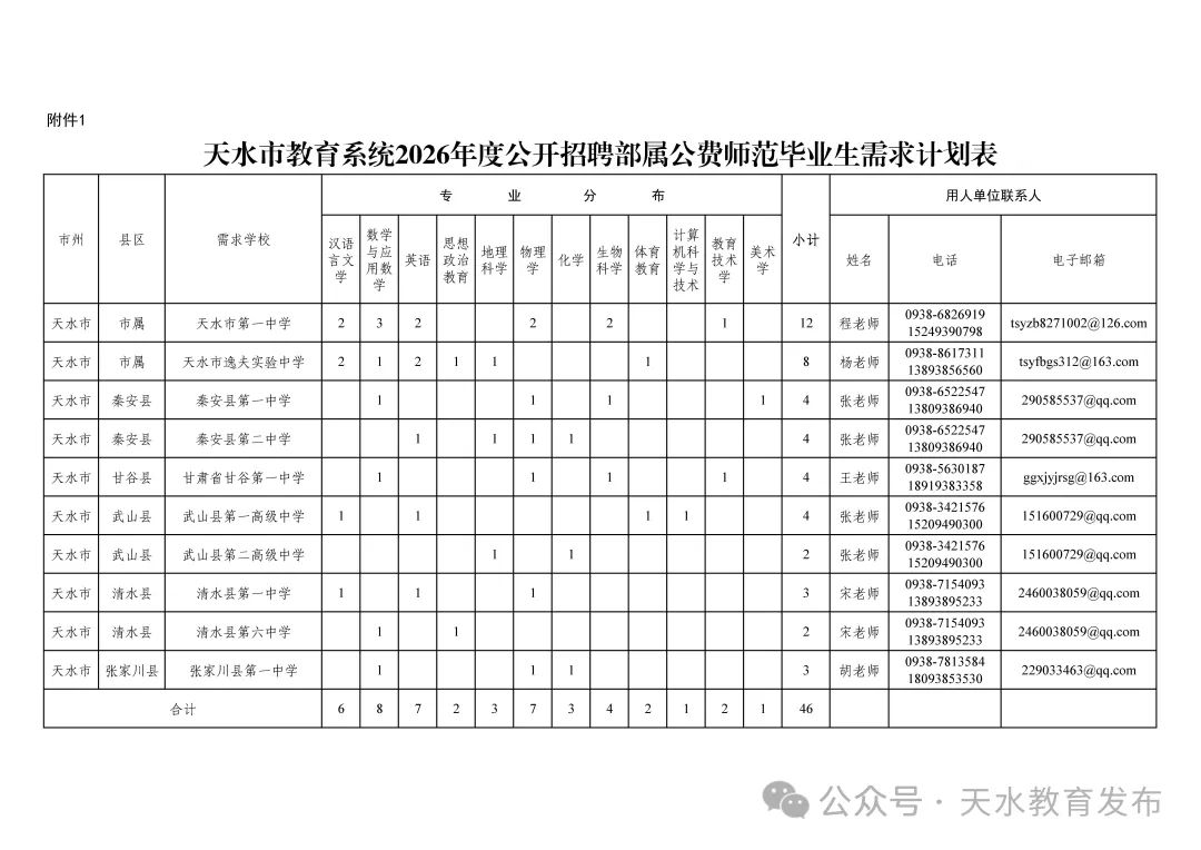 1.部属公费师范毕业生。天水市教育系统计划招聘46人,具体计划详见《天水市教育系统2026年度公开招聘部属公费师范毕业生需求计划表》(附件1)。