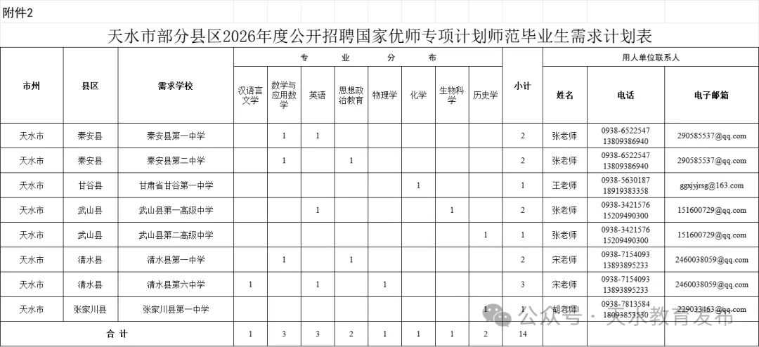 2.国家优师专项计划师范毕业生。秦安县、甘谷县、武山县、清水县、张家川县计划招聘国家优师专项计划师范毕业生14人,具体计划详见《天水市部分县区2026年度公开招聘国家优师专项计划师范毕业生需求计划表》(附件2)。