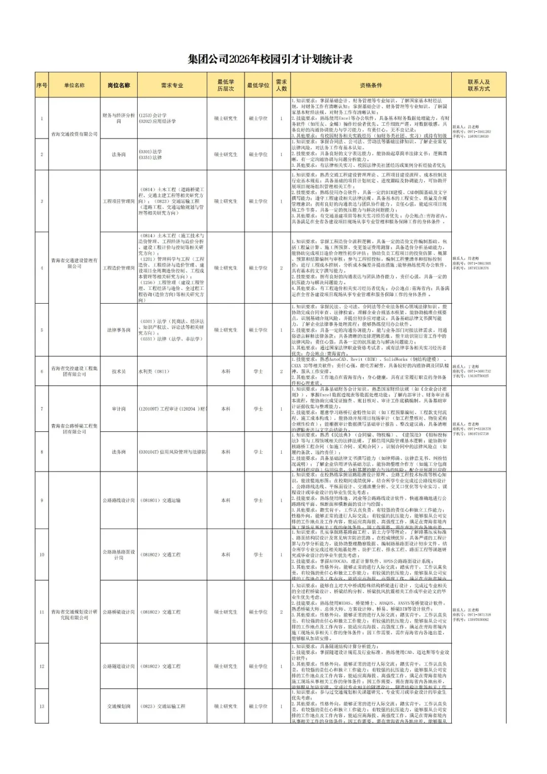 本次发布的38个岗位,涵盖交通工程、土木工程、法学、财务管理、环境科学、新能源、信息技术、广告与新媒体等多个专业方向,具体岗位信息详见附件《青海省交通控股集团有限公司2026年度校园引才岗位统计表》。