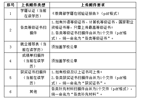 3.上传应骋附件材料。应聘毕业生通过招聘平台及时、规范上传个人应聘附件材料,上传附件数量般不超过7个。应聘毕业生应确保应聘材料能正常打开、清晰显示,因应材料不能正常打开、图像不清晰或未按规范要求填报将影响简历筛选结果。上传附件清单如下: