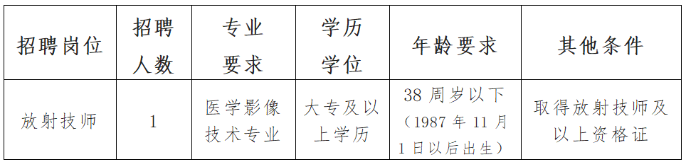 因医院工作需要,决定面向社会公开招聘编外聘用制专业技术人员1名,具体事项如下: