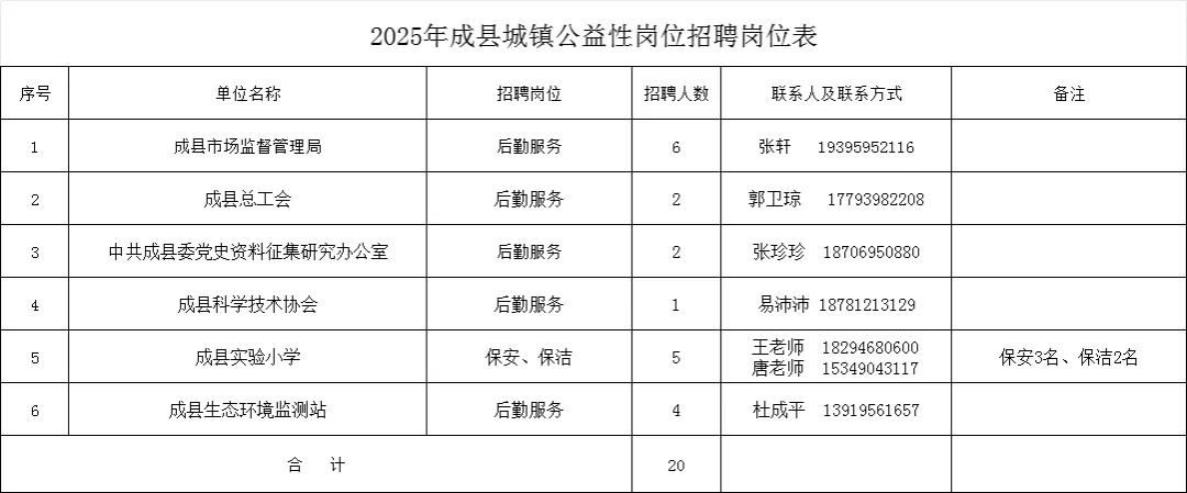 附:《2025年成县城镇公益性岗位招聘岗位表》