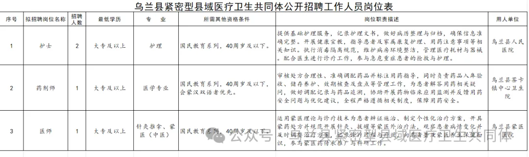 本次招聘由乌兰县紧密型县域医疗卫生共同体综合办公室进行统一招聘,招聘后人员按照《乌兰县紧密型县域医疗卫生共同体公开招聘工作人员岗位表》(以下简称《岗位表》进行分配,招聘岗位、人数和相关要求详见《岗位表》。