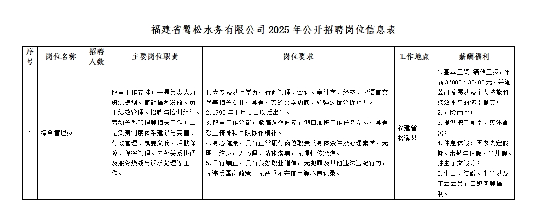 本次招聘岗位及招聘条件详见文后《福建省鹭松水务有限公司2025年公开招聘信息表》
