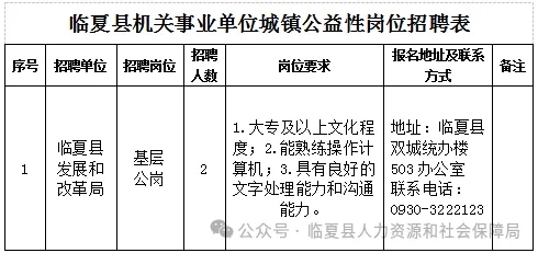 4.联系人:各机关事业单位联系人(详见临夏县公益性岗位需求表)
