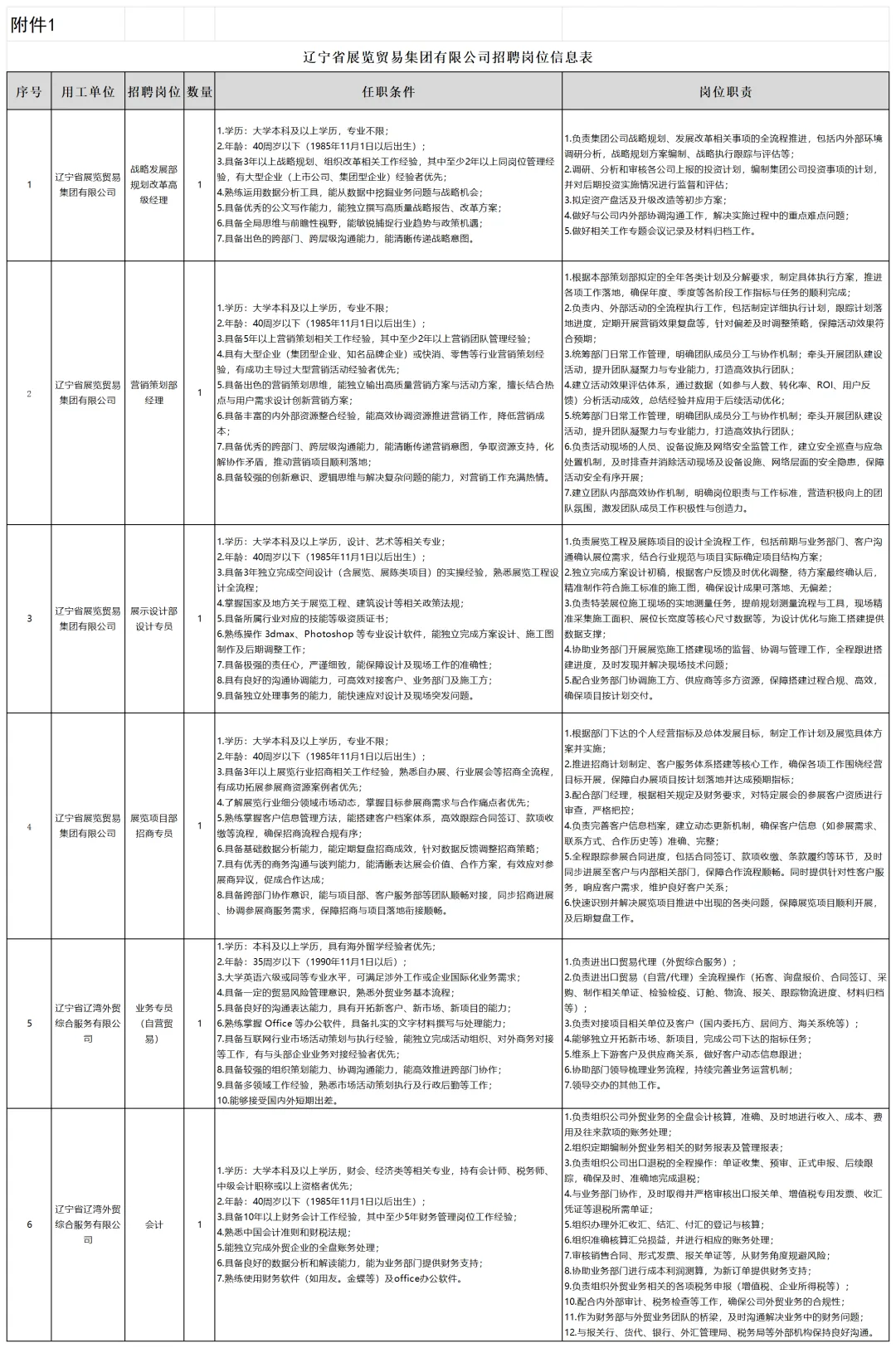 见《辽宁省展览贸易集团有限公司招聘岗位信息表》(附件1)