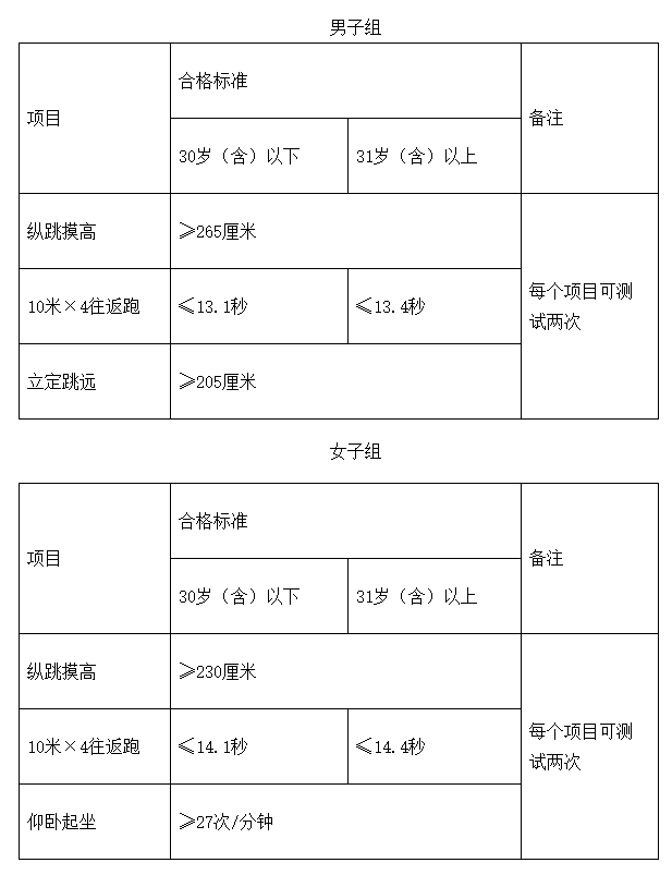 体能测试设3个项目,分别为纵跳摸高、10米×4往返跑、立定跳远(男)/仰卧起坐(女),每个项目测试次数不超过2次。体能测试采用达标制,任意一项不达标即为体能测试不合格。体能测试不设缓测、补测,合格标准如下:
